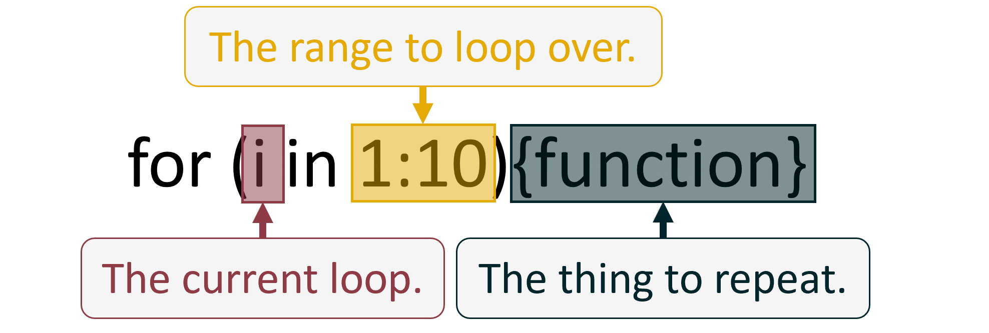 Everything that isn’t highlighted is just the syntax of the for loop, but that doesn’t mean it isn’t also important to understand. Case and point, these next two code chunks will execute identically and produce the same results, even if they look a bit different.